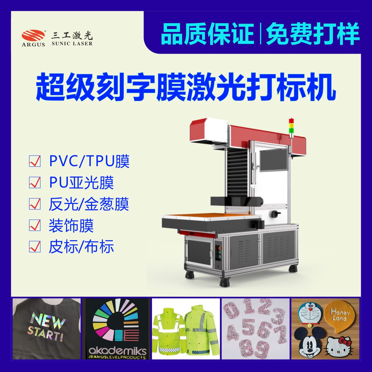 適用于運(yùn)動服飾、休閑服飾、童裝、特種服飾、衣帽、鞋業(yè)、等行業(yè)的激光打標(biāo)和模切。