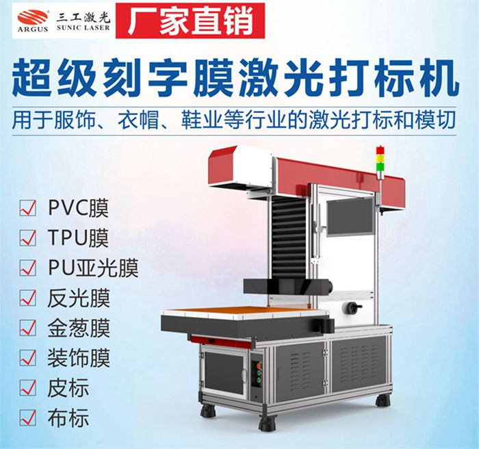 超級刻字膜激光打標機適用于運動服飾、休閑服飾、童裝、特種服飾、衣帽、鞋業、等行業的激光打標和模切。可PVC刻字膜、TPU刻字膜、PU亞光刻字膜、夜光刻字膜、鐳射軟金屬刻字膜、噴繪打印膜、反光刻字膜、植絨刻字膜、金蔥刻字膜、反光絲印膜、弱溶劑打印膜、裝飾膜、皮標、布標等材料雕刻切割。