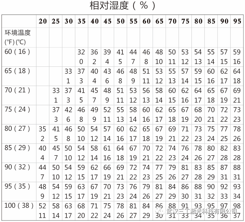 注意:激光器最佳工作水溫為:19℃~25℃,視情況水溫最高可以設定在28℃,但是在此溫度下,功率可能略有降低。請參考下方環境溫度和相對濕度對應的露點溫度。