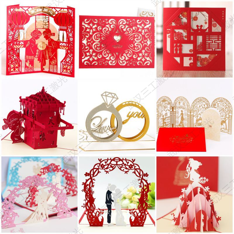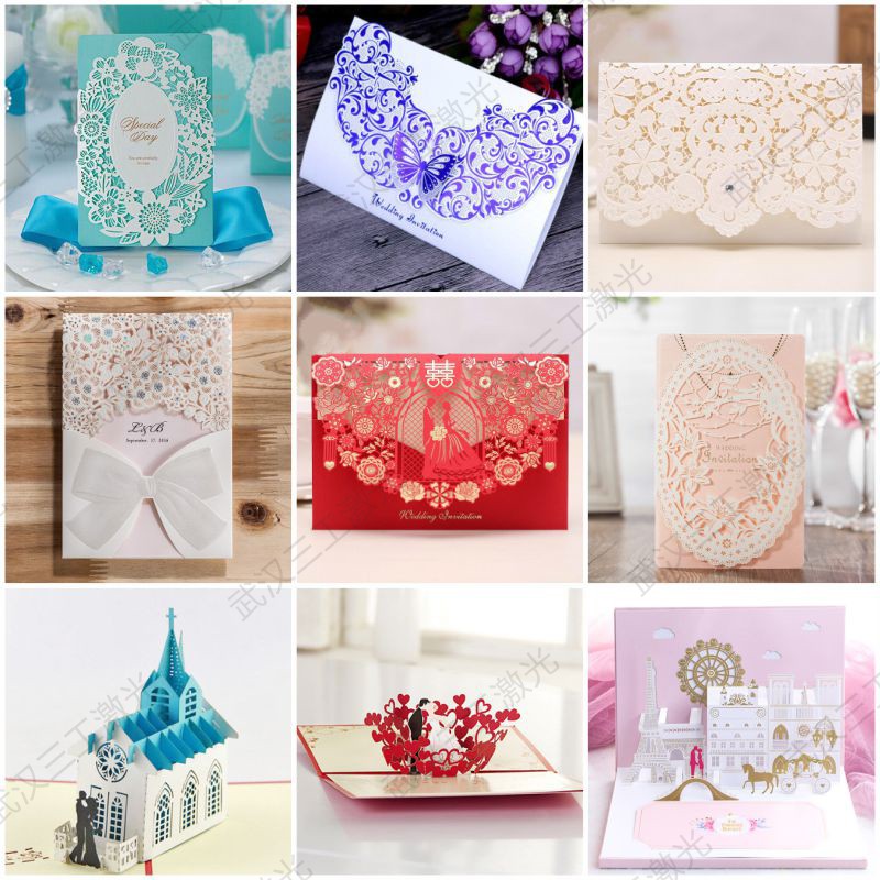 婚禮請柬完全可以摒棄正正方方的外觀,在電腦上制圖后,武漢三工請柬激光鏤空機就能不受限制地依據圖紙上的內容制作出所需要的圖案或文字內容,打開請柬后便能出現立體的圖形。