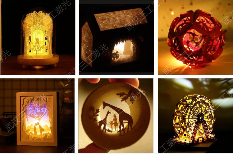 暖暖的燈光透過一層層剪影,呈現出童話里的畫面,匠心獨運的設計,精心打磨的細節,做成后燈光柔和溫馨,宛如落日余暉。這種精美的紙雕便是用紙品激光鏤空機鏤空雕刻而成的,制作完成后也可以通上電源當小夜燈使用,美麗而實用。