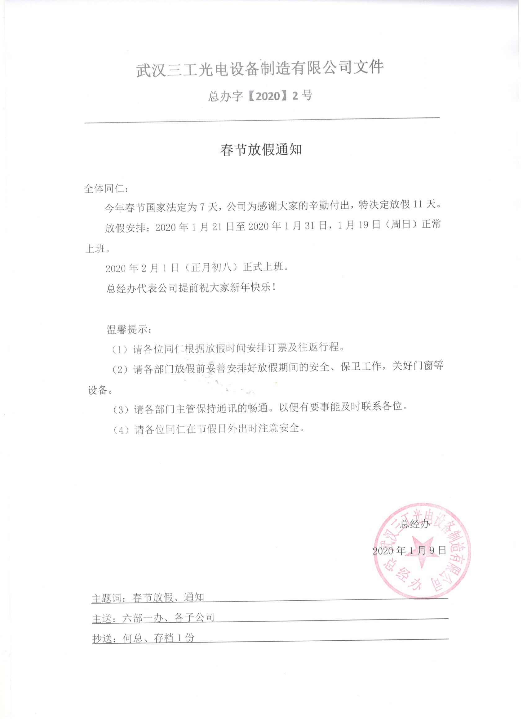 武漢三工集團2020年春節放假通知