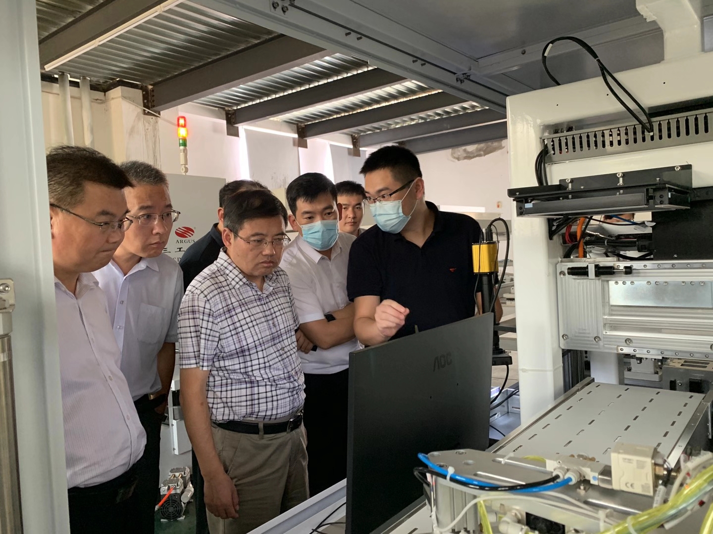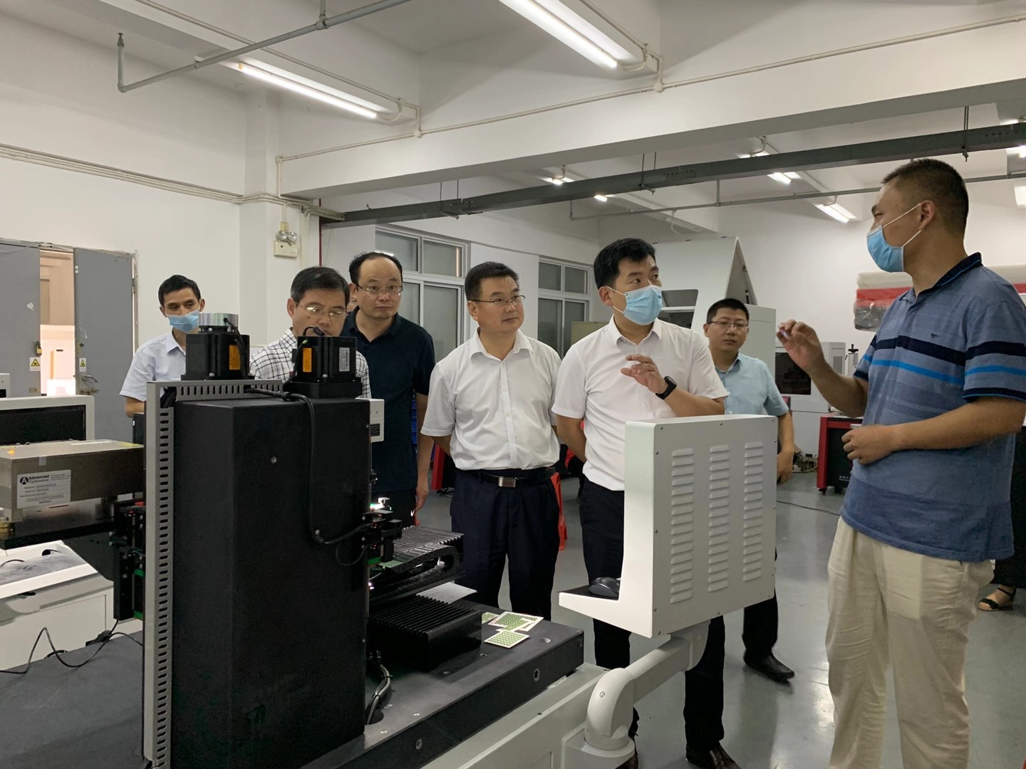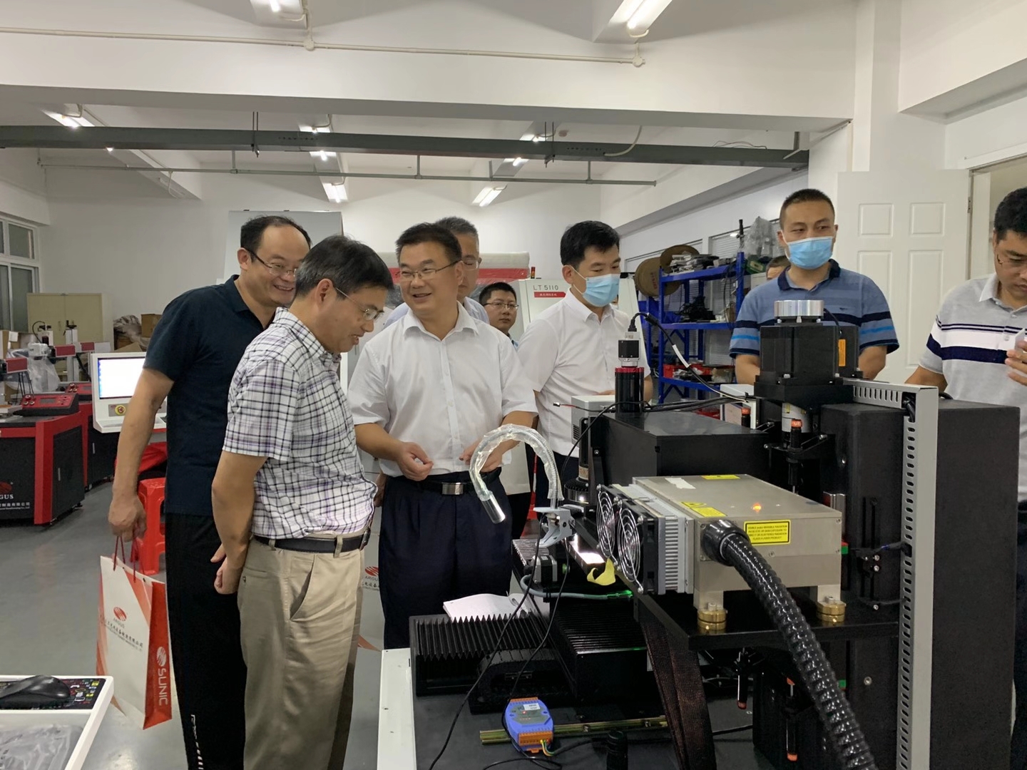 2020年9月2日山東省臨沂市國有資產(chǎn)投資控股集團(tuán)有限公司黨委書記、董事長(zhǎng)魯峰武,臨沂經(jīng)濟(jì)技術(shù)開發(fā)區(qū)黨工委委員、管委會(huì)副主任楊振魁等一行考察團(tuán)蒞臨武漢三工光電設(shè)備制造有限公司參觀指導(dǎo)。