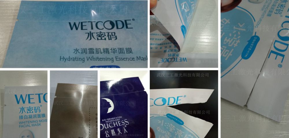 以下是三工激光根據不同品牌的面膜袋打樣的成品以及撕開效果圖: