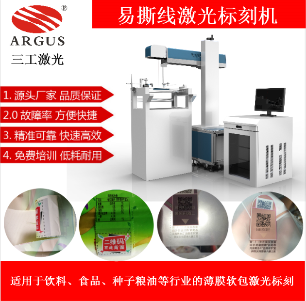 使用激光設備來改進包裝袋的易撕口工藝,是由三工激光率先提出并且已成功運用在很多包裝袋生產廠家。激光標刻易撕口工藝用在面膜包裝袋上,主要體現在將易撕口改變成易撕線,激光在面膜包裝帶上打上一排微型的虛線孔,讓消費者能整齊而又方便的撕開面膜包裝袋。而且由于面膜包裝袋由多層復合材料組成,并且有密封和阻隔要求,激光標刻機可以精準的控制激光打孔的深度從而只打半透的虛線孔,既保證了包裝袋的完成性又讓包裝袋美觀易撕。